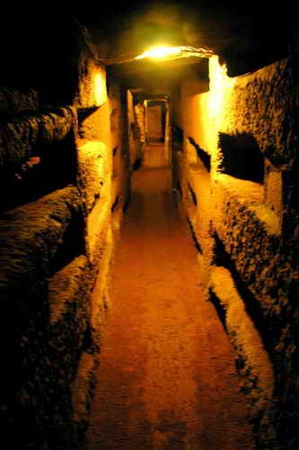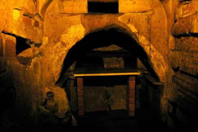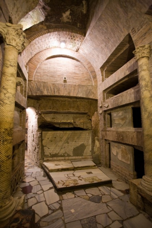 Примечательно, что словом “катакомбы”, изначально относившимся только к месту, где среди прочих христиан был похоронен святой Севастиан, постепенно стали наименоваться все подземные захоронения. В Древнем Риме усопших кремировали, их нельзя было хоронить в черте города, и катакомбы использовались как кладбища. В пластах туфа, мягкого и легкого в обработке, христиане прокладывали коридоры с углублениями для тел. Во времена гонений они собирались здесь вместе и на надгробных плитах мучеников совершали литургию.