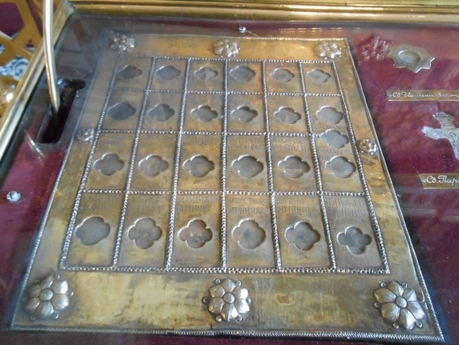 В мощевике, где хранится частица мощей мученика Севастиана, есть также частицы мощей апостолов Петра и Павла.