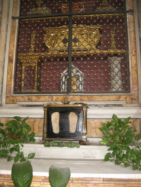 В правом приделе римской церкви «Вне стен Сан-Себастьяно» напротив престола с мощами мученика Севастиана хранится подлинный камень с отпечатавшимися на нем следами Спасителя.