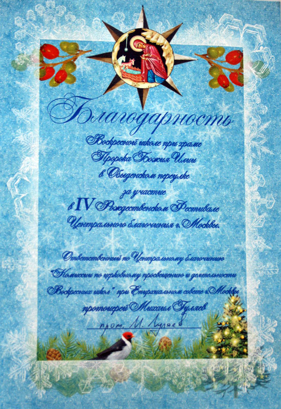 Четвертый раз наша воскресная школа принимает участие в Рождественском фестивале Центрального благочиния, проводящемся в храме святой мученицы Татианы при Московском университете. В этом году с рождественскими колядками выступила младшая группа воскресной школы (педагоги А.С. Щенков, С.А. Судакова, Т.В. Качала, В.Н. Плетнева). Успехи выступавших были отмечены грамотой руководства воскресных школ Центрального благочиния.