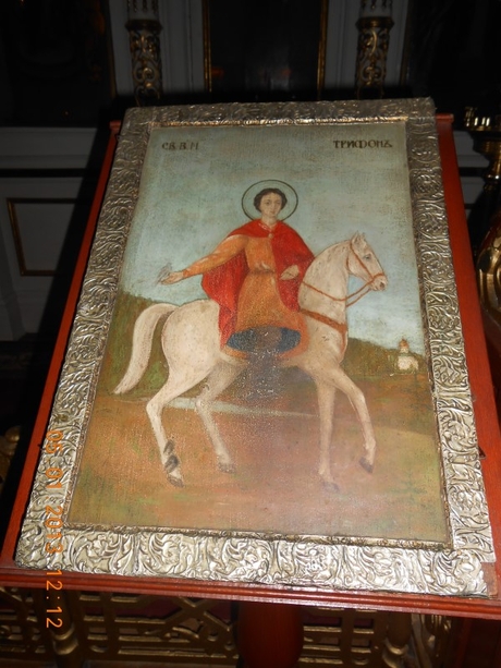 В нашем храме, в мощевике в приделе первоверховных апостолов Петра и Павла, находится частица мощей мученика Трифона, а в приделе праведных Симеона Богоприимца и пророчицы Анны — его икона.