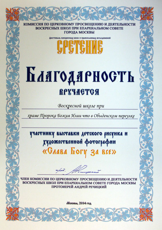 Выставка детского рисунка и художественной фотографии «Слава Богу за всё» проводилась по благословению митрополита Истринского Арсения, управляющего Центральным и Южным викариатствами г. Москвы, в рамках IX Сретенского фестиваля при поддержке Центрального и Южного викариатств г. Москвы, Комиссии по церковному просвещению и деятельности воскресных школ при Епархиальном совете г. Москвы и Российского православного университета святого Иоанна Богослова.