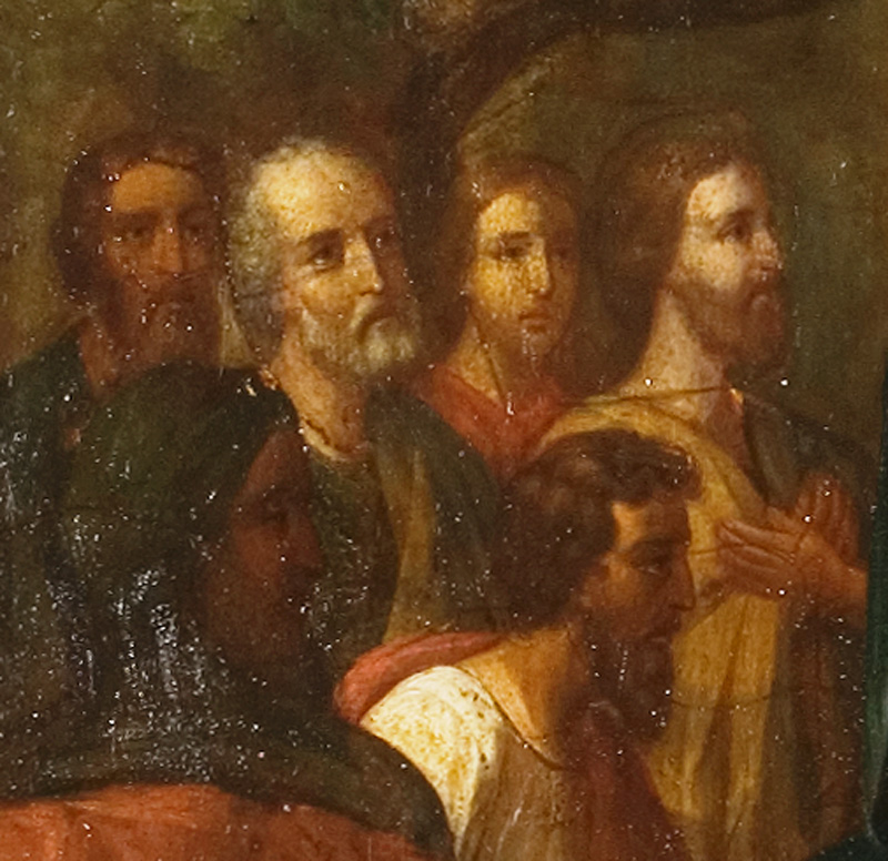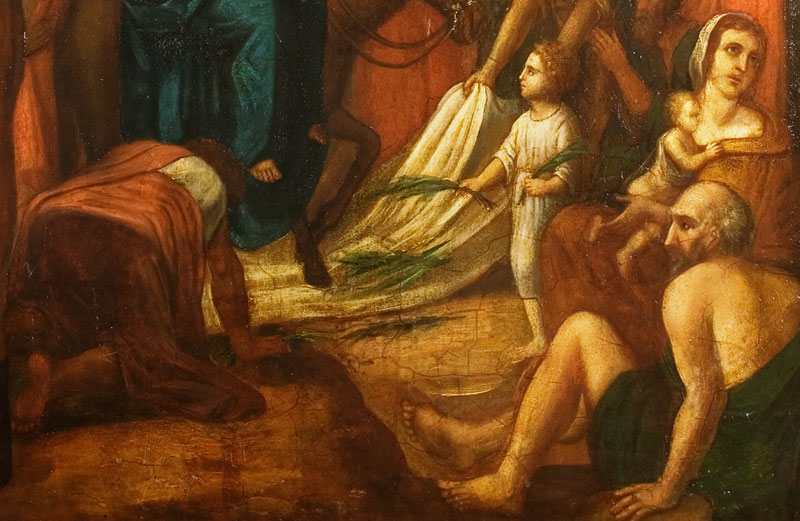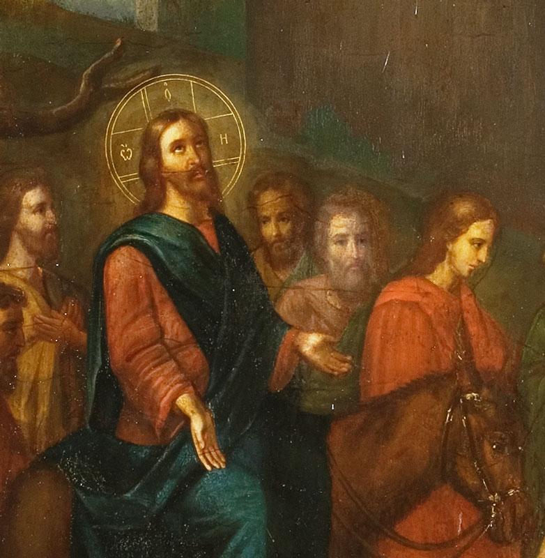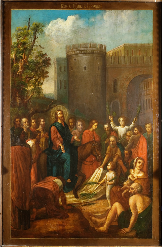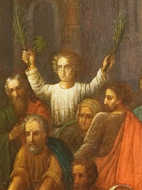 Но в нашем храме, кроме таких, привычно расположенных, икон, имеется еще одна. В приделе первоверховных апостолов Петра и Павла, справа от Царских врат, как и предполагает устройство православного храма, мы видим Спасителя. Но не Пречистый Лик Его и не Восседающего на Престоле Вседержителя, а Господа, на молодом осле въезжающего в Иерусалим. Вот они, стены древнего града, встречающего своего Царя, вот иудейские люди, постилающие пальмовые ветви и свои одежды перед Сыном Давидовым, вот ликующие дети, восклицающие «Осанна!» Наверное, иконописец не захотел омрачать образ изображением тех, кто лицемерно советовал Господу унять торжествующий народ, и мы видим только искреннее излияние восторженных чувств.