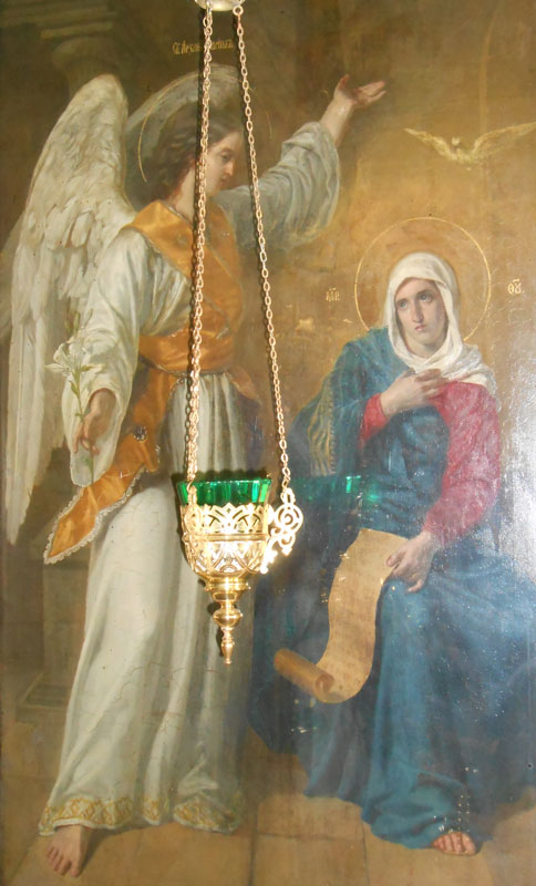 Слева от Царских врат находится икона, посвященная еще одному двунадесятому празднику — Благовещению Пресвятой Богородицы. И — удивительное дело! — несмотря на то, что оба праздника обычно приходятся на скорбный Великий пост, молящихся у этих образов не покидает чувство радости и надежды. Существует внутренняя связь между «спасения нашего главизной» и явлением Господа во славе и торжестве перед Своими Крестными Страданиями.