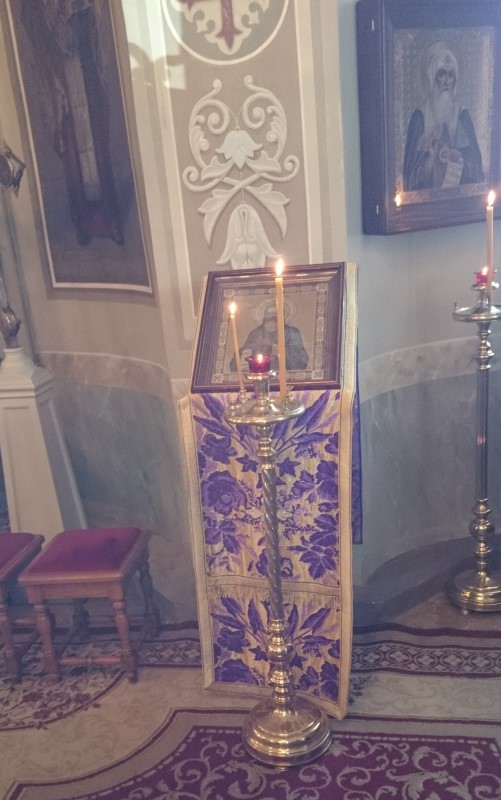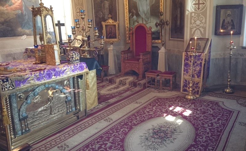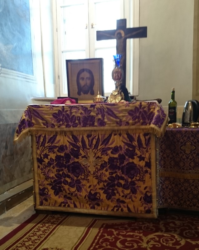В Великий Четверг, в день установления Спасителем Таинства Евхаристии, священнодействия совершались на жертвеннике и престоле, покрытых фиолетовым облачением из дорогой греческой парчи.