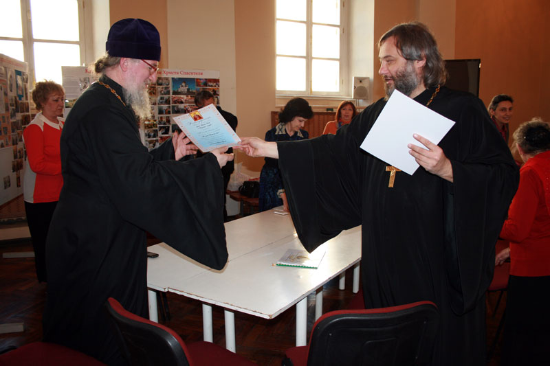 На круглом столе с докладом о продолжающемся паломничестве учащихся Обыденской воскресной церковно-приходской школы «По дорогам преподобного Сергия Радонежского» выступил клирик нашего храма протоиерей Николай Скурат. Т.В. Качала рассказала о детских музыкальных и других праздниках, регулярно организуемых в нашем приходе. На этом мероприятии в рамках показа короткометражных приходских фильмов был продемонстрирован фильм о приходском детском пасхальном празднике в Илие-Обыденского храме, смонтированный Л. Кулаковой, использовавшей фото из электронного архива воскресной школы.