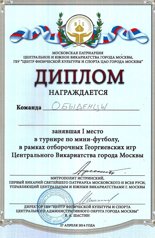 Таким образом, в упорной борьбе «Обыденцы» заняли 1-е место и будут отстаивать честь Центрального викариатства на VII финальных Георгиевских играх среди викариатств г. Москвы. Наша команда была награждена дипломом, подписанным Высокопреосвященнейшим Арсением, митрополитом Истринским, первым викарием Святейшего Патриарха Московского и всея Руси, управляющим Центральным и Южным викариатствами города Москвы.