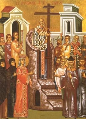 Избраннии предвечным Царем, святии равноапостольнии Константине и Елено, на всемирное воздвижение Животворящаго и Спасительнаго Креста Господня, имже соделася спасение рода человеческаго, искупленнаго кровию пригвожденнаго на нем Агнца Божия, да вси праведнии и грешнии благодарственно взывают вам: Радуйтеся, святии равноапостольнии Константине и Елено, обретшии Крест Господень, оружие спасительное (1-й кондак акафиста).