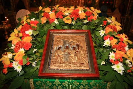 Накануне праздника, в субботу вечером, было совершено торжественное всенощное бдение, к началу которого храм усилиями его работников преобразился, облачившись в традиционное для Троицы зеленое убранство. Свежесть и аромат березовых ветвей, цветов и травы, покрывшей старинные плиты храмового пола, напомнили о явлении Троицы праотцу Аврааму у дуба Мамврийского, о Сионской горнице, украшенной в честь иудейской Пятидесятницы зеленью, и о таинственном обновлении душ благодатью Святого Духа.