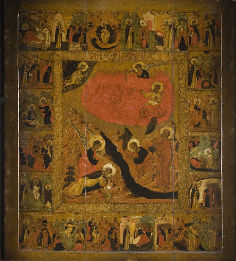 Первое клеймо говорит нам о славном рождении святого, при котором его отец Савах увидел ангелов, возвещающих пророческое служение Илии. Далее следует обличение нечестивого израильского царя Ахава за отступление от Бога и как наказание - начало засухи и голода по слову пророка.