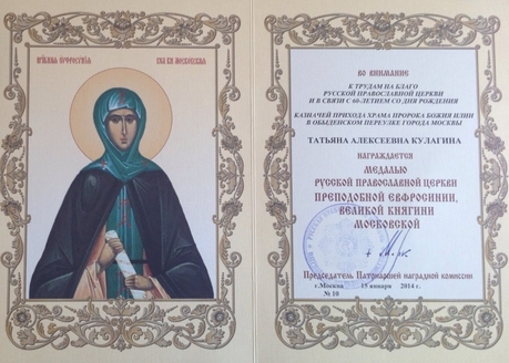 Во внимание к трудам на благо Русской Православной Церкви и в связи с 60-летием со дня рождения казначей прихода храма пророка Божия Илии в Обыденском переулке города Москвы Татьяна Алексеевна Кулагина награждена медалью Русской Православной Церкви преподобной Евфросинии, великой княгини Московской.