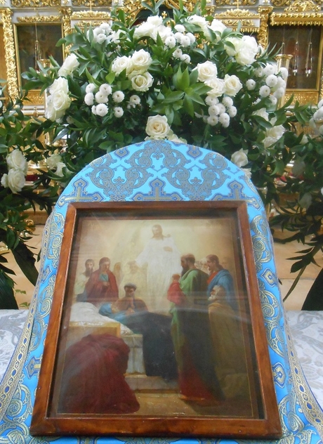В канун праздника, 27 августа, в нашем храме при большом стечении верующих было совершено соборное всенощное бдение. Во время утрени, на полиелее, из алтаря была вынесена и возложена посреди храма Плащаница Божией Матери.