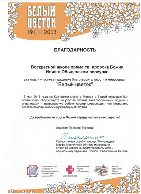 Наше участие, позволившее оказать помощь многим нуждающимся в ней людям, было отмечено благодарностью, подписанной преосвященнейшим Пантелеимоном, епископом Орехово-Зуевским.