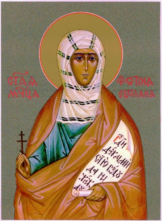 О, святая мученица Фотино! Безмерно любовию ко Христу окрыляема, мужество, терпение и силу великую с находящимися с тобою сестрами, сыновьями и просвещенными тобою явила еси. Евангелие Христово с дерзновением проповедала, и явися тебе и всем, с тобою бывшим, Христос, и всех на предстоящия муки укрепил и утешил. В Рим пришедши и безбоязненно Христа исповедавши, в темницу заключена быша, и многия муки претерпеша, в колодезь брошена, душу свою Господу предала еси. Услыши нас, святая Фотино, духовною красотою воссиявшая и людей непрестанно и неумолкаемо, в темнице и в городах, вере во Христа поучавшая. Внемли нам, взирая на нас грешных, и благодатию Христовою исцели болящих лихорадкою, да не окропит их дождь греховный, но в здравии душевном и телесном жизнь свою неослабно в добрых делах проведут и прославят Владыку всех, Отца щедрот, Бога Милостиваго, во все века. Аминь.
