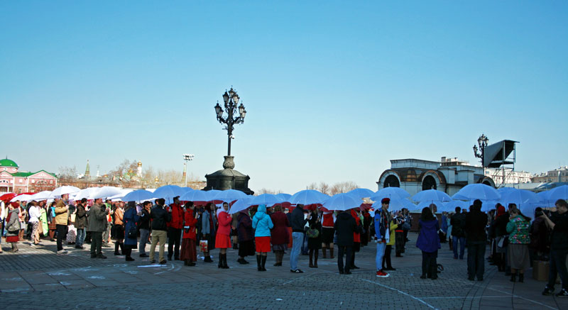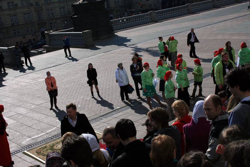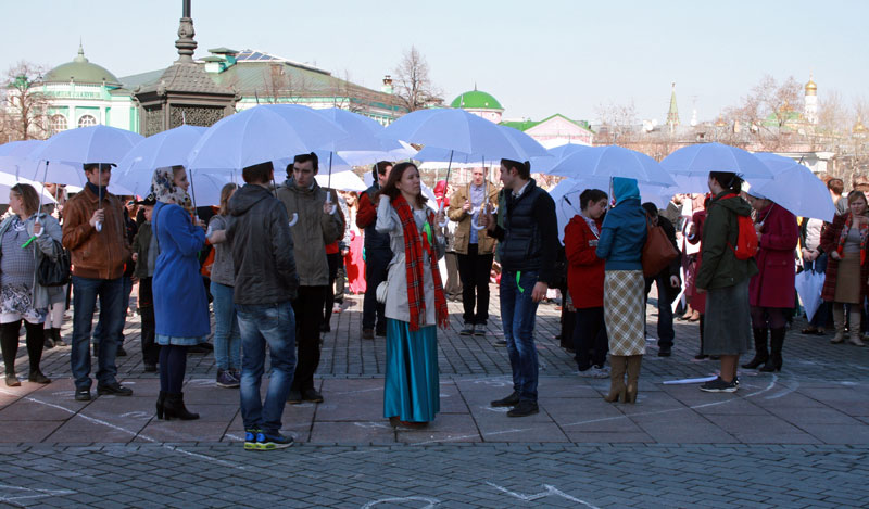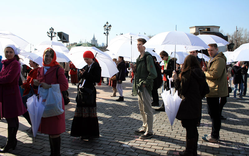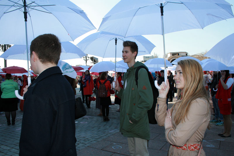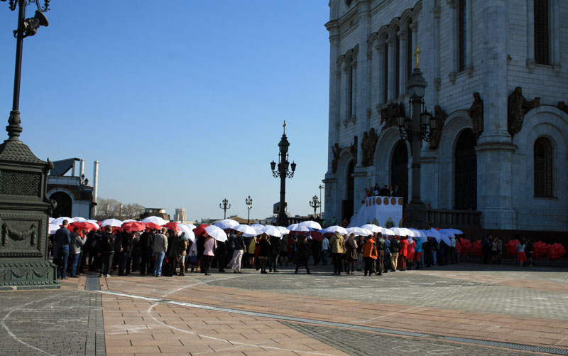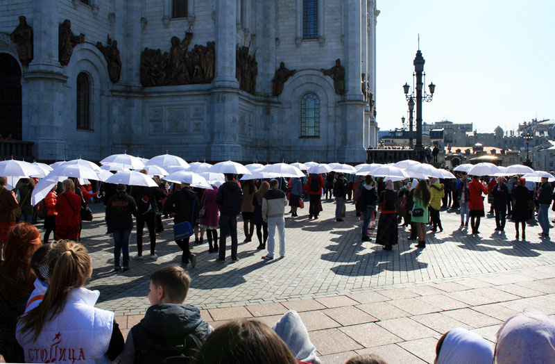 Молодые люди заранее готовили это поздравление в формате флешмоба, участвовали в нескольких репетициях. У кого-то в руках были красные или белые зонтики, другим раздали красные шарики. Молодежь должна была выстроиться так, чтобы получилась фигура белого храма с красным сердцем внутри — по слову Спасителя: «Ибо, где сокровище ваше, там будет и сердце ваше» (Мф. 6, 21). Это сердце символизировало преданность молодежи Церкви и осознанный ее выбор сокровища веры и жизни со Христом. Затем после перестроения получалась фигура пасхального красного яйца с белыми буквами «ХВ» внутри.