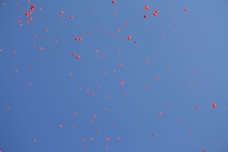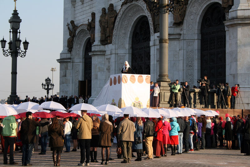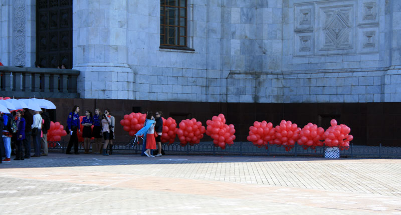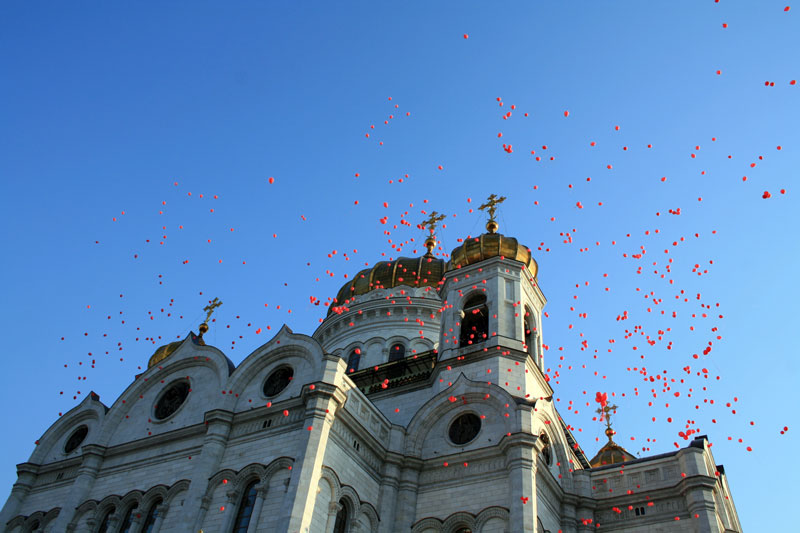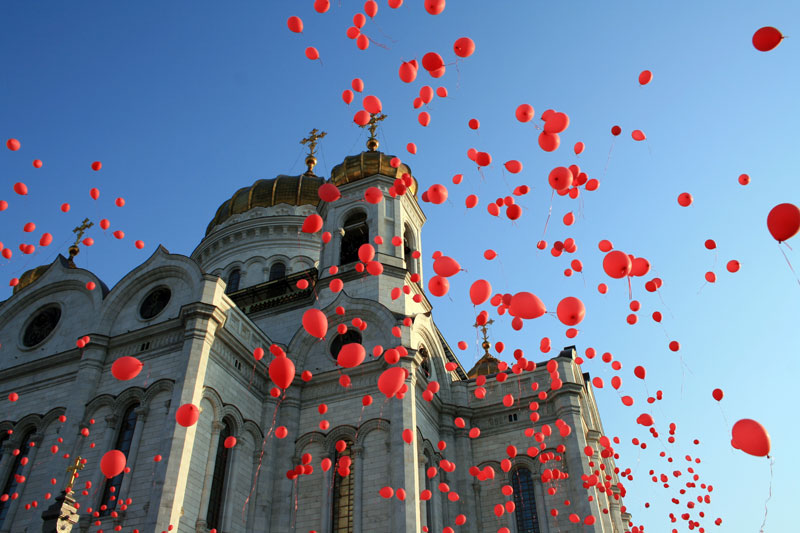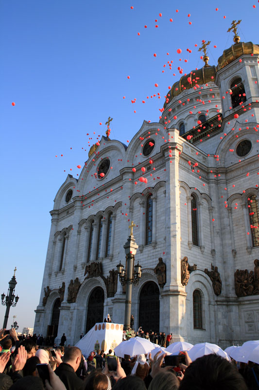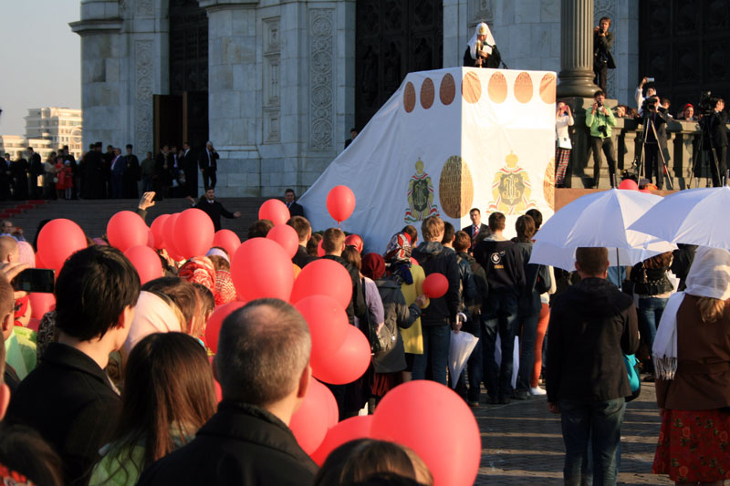 Потом собравшаяся молодежь выстроилась на площади у алтарной части кафедрального собора и показала приготовленное поздравление. После приветственного слова Святейшего Патриарха в небо выпустили 1000 красных шаров, возвещая всему городу радостную весть о Воскресении Христовом.