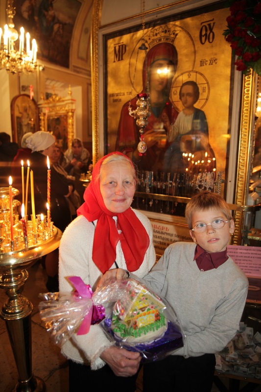 Вручение даров началось еще в Великую Субботу. Семьи Потехиных, Кусковых, Одинцовых и Слесаренко в этот день отправились домой не только с освященными куличами и яйцами, но и с нарядным, почти сказочным, пряничным домиком, который очень понравился детям. Пришедшие на ночную пасхальную службу Чернеевы, Дорохины, Веселовские, Ларионовы и Логвиненко получили праздничный подарок по ее окончании, а семьи Рухман, Карпович и Сурвилло — после второй литургии, вместе с привествием “Христос воскресе!”.
