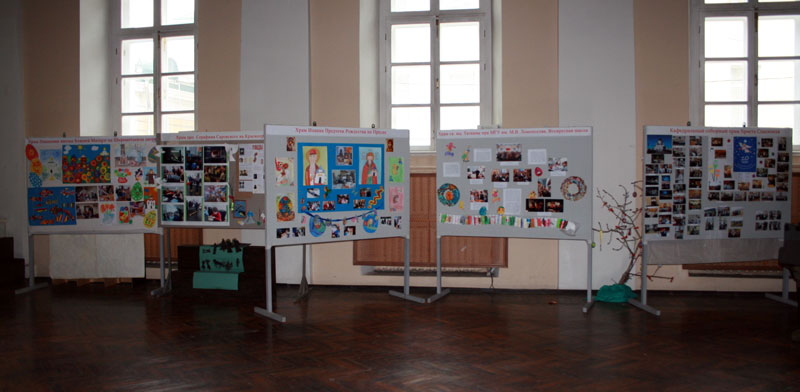 На выставке были представлены детские творческие работы и фотоматериалы, рассказывающие об основных событиях в жизни школ Центрального благочиния в этом учебном году.