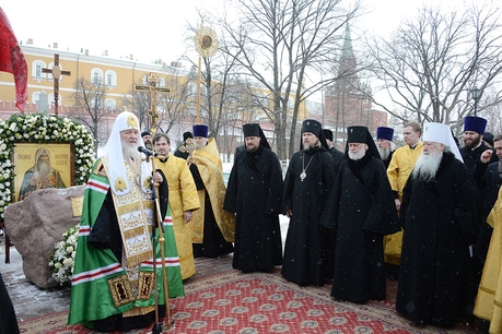 В марте этого года, в день преставления святителя Ермогена, после Божественной литургии в Успенском соборе Московского Кремля Святейший Патриарх Кирилл отслужил молебен на месте будущего памятника в Александровском саду.
