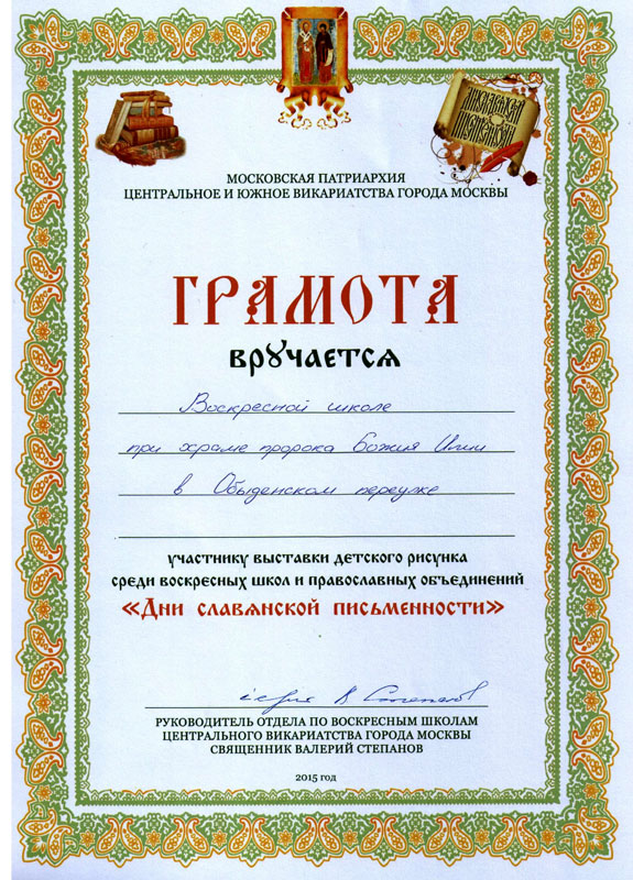 Выставка «Дни славянской письменности» прошла в рамках Сретенского фестиваля по благословению митрополита Истринского Арсения, управляющего Центральным и Южным викариатствами г. Москвы. Наша воскресная школа предоставила на выставку десять рисунков, большинство которых были выполнены на занятиях у педагога М. В. Судаковой. Все участники выставки были награждены грамотами, получили в подарок воздушные шарики и сладкие угощения. Для детей и их родителей также был организован праздничный концерт.
