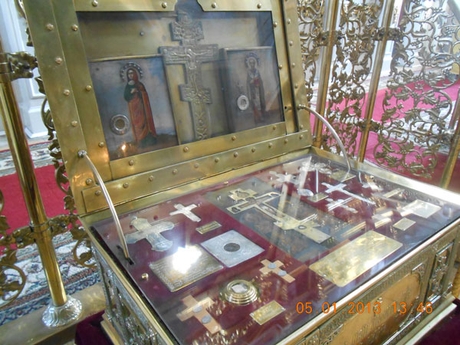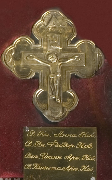 Среди святынь, хранящихся в трех мощевиках нашего храма, немало частиц киевских святых. Частица мощей святого Никиты находится в левом мощевике у главного алтаря.