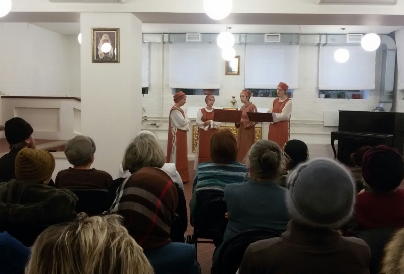 В субботу, 16 января, прихожане нашего храма имели возможность побывать на выступлении ансамбля древнерусского певческого искусства «Асматикон» при научно-исследовательском центре церковной музыки имени протоиерея Димитрия Разумовского МГК им. П. И. Чайковского, художественным руководителем которого является Анна Елисеева. Прошедший по благословению настоятеля протоиерея Максима Шевцова в храмовом доме причта концерт был необычным по содержанию — он целиком посвящался знаменному распеву и византийским церковным песнопениям (осьмогласию). Инициатором музыкального мероприятия выступил священник Андрей Дорохин, а организатором — наша прихожанка и сотрудница библиотеки истории русской философии и культуры «Дом А. Ф. Лосева» Ольга Михайловна Ланенкина.