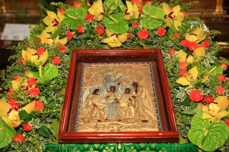 Накануне праздника, в субботу вечером, было совершено торжественное всенощное бдение, к началу которого храм усилиями его работников преобразился, облачившись в традиционное для Троицы зеленое убранство. Возглавил богослужение настоятель храма протоиерей Максим Шевцов. Свежесть и аромат березовых ветвей, цветов и травы, покрывшей старинные плиты храмового пола, напомнили о явлении Троицы праотцу Аврааму у дуба Мамврийского, о Сионской горнице, украшенной в честь иудейской Пятидесятницы зеленью, и о таинственном обновлении душ благодатью Святого Духа.