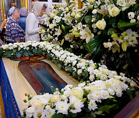 В канун праздника, в этом году совпавшего с воскресным днем, в нашем храме при большом стечении верующих было совершено соборное всенощное бдение. Во время утрени, на полиелее, из алтаря была вынесена и возложена посреди храма Плащаница Божией Матери.