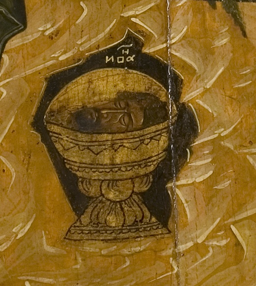 Событие сегодняшнего праздника отражены на замечательной иконе XVII века «Усекновение главы Иоанна Предтечи» работы мастеров Оружейной палаты, расположенной в местном ряду главного иконостаса нашего храма. Ее композиция совмещает два сюжета — ведение святого Иоанна на казнь и усекновение его главы, которая изображена также в сосуде в нижней части иконы, предвозвещая ее сокрытие и обретение.