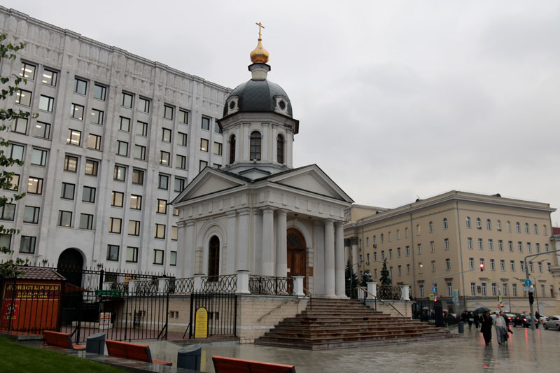 Паломники побывали в храме-часовне святых благоверных князей Бориса и Глеба на Арбатской площади. Впервые церковь упоминается в 1483 г. как деревянная в древнерусской летописи «Софийском Временнике». В 1527 г. она значится в летописях уже как каменная, построенная по повелению великого князя Василия Ивановича. Как полагают, в середине XVI столетия храм считался даже собором и имел особое значение, так как был местом царского моления перед началом военных походов. В XVIII в. история церкви была связана с двумя знатными московскими семьями графов Бестуживых-Рюминых и Мусиных-Пушкиных. Оба семейства были главными благотворителями храма и имели в церкви свои собственные приделы, обустроенные как родовые склепы. В 1930 г. храм был снесен, как и соседняя с ним церковь святителя Тихона Амафунтского. В 1997 г. в память о стоявших на Арбатской площади церквях была воздвигнута Борисоглебская храм-часовня.