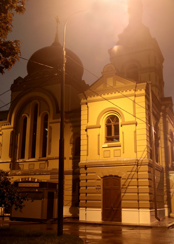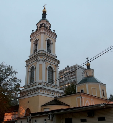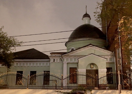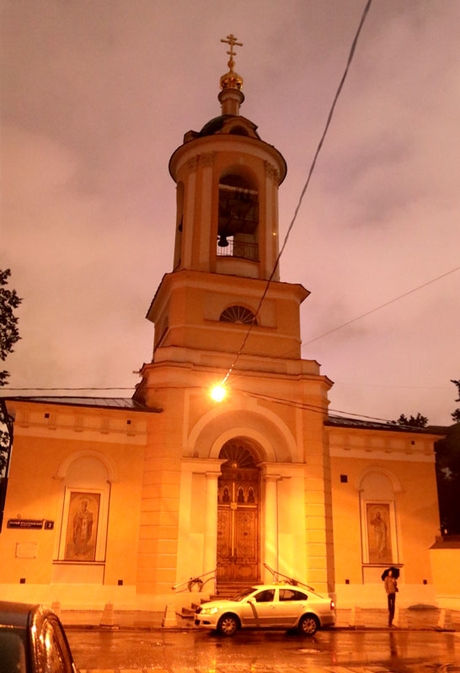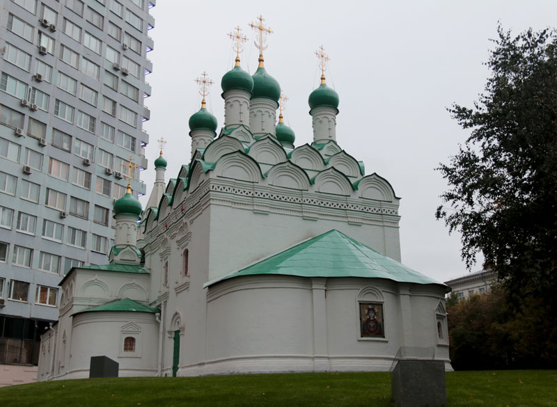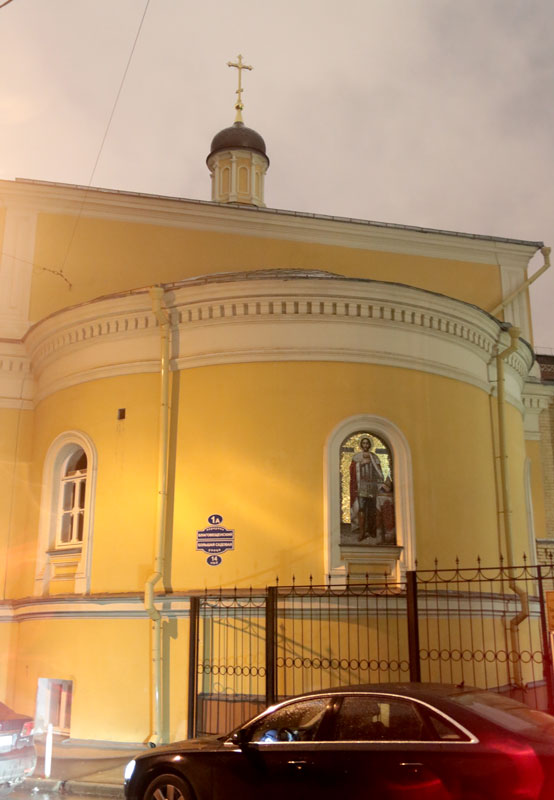Осмотрев великолепие Никольского храма, группа направилась к церкви великомученика Георгия Победоносца в Грузинах — единственному храму в Москве, в котором богослужение ведется не только на церковнославянском, но и на грузинском языке. Это берет начало еще в ХVIII веке, когда в столице поселилась грузинская диаспора. Грузины заняли отведенное им село Воскресенское. В селе этом была когда-то устроена по указу царя Алексея Михайловича деревянная церковь в память Иоанна Богослова, но к середине XVIII в. она сгорела. Место было удобное — недалеко от грузинского дворца. Поэтому сын царя Георгий Вахтангович испросил разрешения возобновить храм на том же месте, но в честь святого великомученика Георгия Победоносца, издавна почитаемого как покровителя Грузии, да еще и личного покровителя царевича. В 1750 г. церковь была построена. По причине разрастания Грузинской слободы в 1895–1898 годах с восточной стороны к храму было пристроено новое здание в русско-византийском стиле. В 1929–1930 гг. церковь великомученика Георгия Победоносца закрыли, переоборудовав ее под электромеханический техникум имени Красина. Сейчас храм святого Георгия на Большой Грузинской принадлежит Русской Православной Церкви, имеет статус Патриаршего подворья.