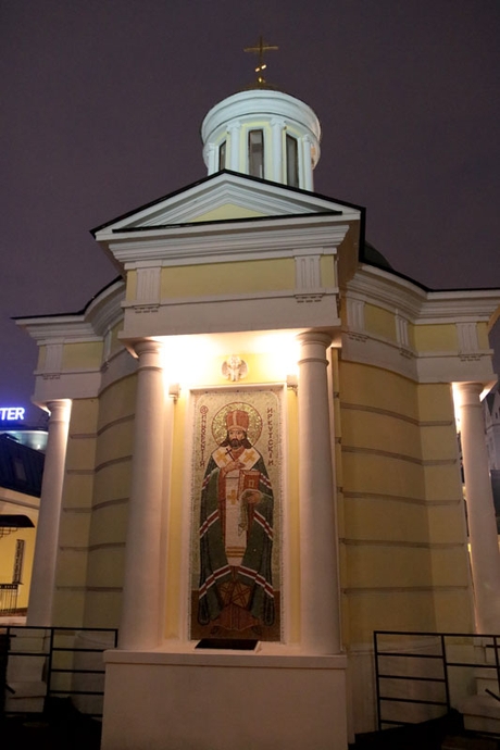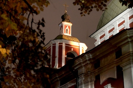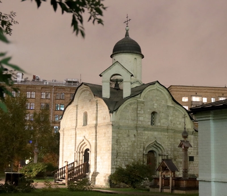 Далее паломники направились к храму мученика Трифона в Напрудном. Дворцовое село Напрудное по дворцовым завещаниям князей известно с 1328 г. При речке Напрудной был Великий пруд, дававший возможность соколиной охоты на «мокрую» птицу. Соколиная охота имела такой большой размах и значение, что в княжении Василия I изображение конного сокольника с птицей в руке получило статус государственного герба Москвы и чеканилось на монетах. По преданию, сокольничий Патрикеев, упустивший любимого царского сокола, нашел его на этом месте по указанию мученика Трифона и потом воздвиг в благодарность святому храм его имени. Среди исследователей нет единого мнения о времени постройки храма. Трифоновская церковь предположительно была возведена в 1470–1480 гг. и является ровесницей Кремлевских соборов. В начале XIX в. Черногорский владыка митрополит Петр Негош передал три частицы мощей от мученической главы святого Трифона, они были в дорогих ковчежцах вделаны в икону святого мученика Трифона с соколом в руке. В 1930 г. Трифоновский храм закрыли. В настоящее время на территории Трифоновской церкви проводятся восстановительные работы, а сам храм приписан к церкви «Знамения» в Переяславской слободе.