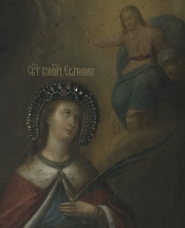 Великомученицу Екатерину — раннехристианскую святую деву, принявшую мученическую смерть за открытое исповедание своей любви ко Христу — на иконах часто изображают в красной одежде, что говорит о ее мученической кончине, и в белом головном покрове, что является знаком целомудрия.