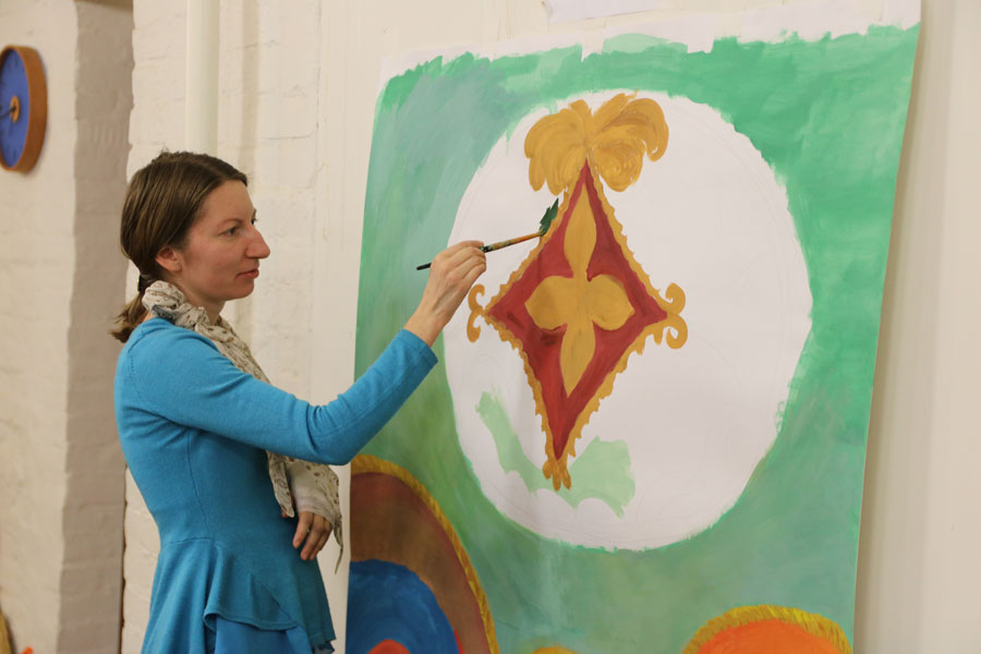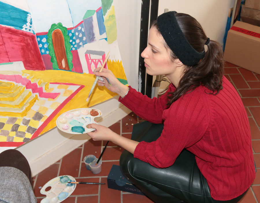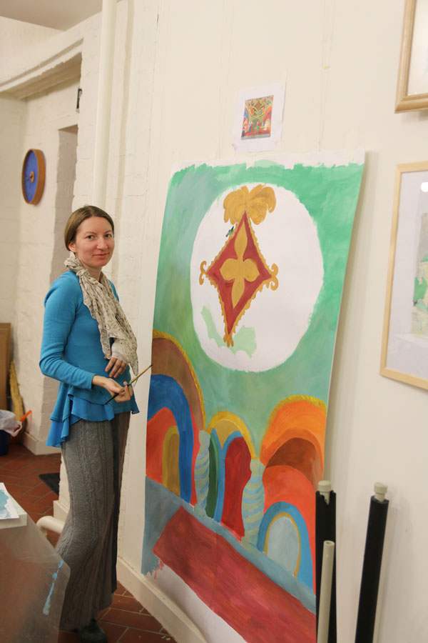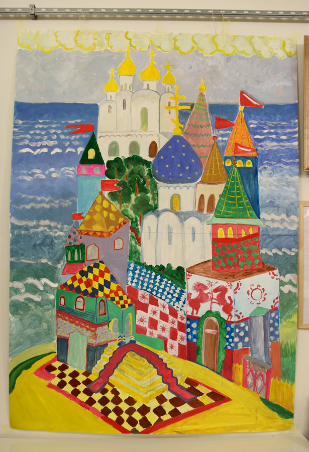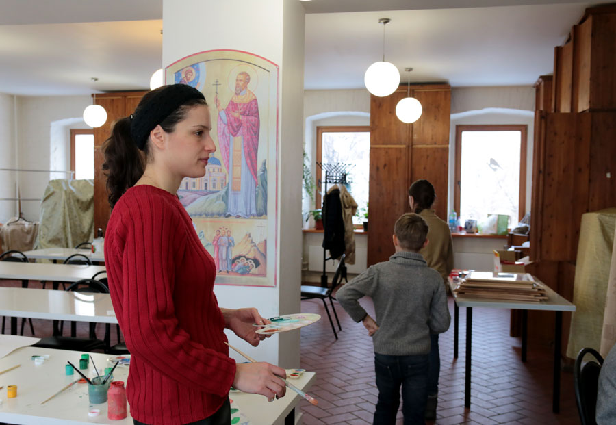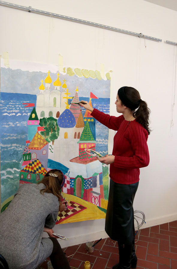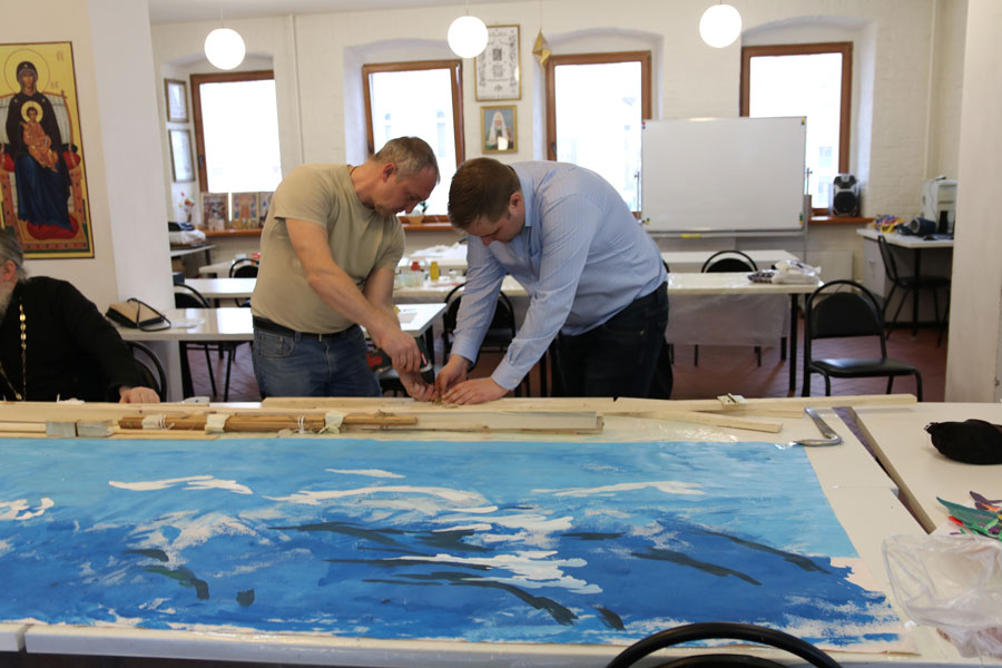 Преподаватели воскресной школы М. В. Судакова, Т. Н. Семенова, М. И. Литвиненко, Е. В. Журбина, приходская молодежь и учащиеся дети и их родители рисуют декорации для детского спектакля.