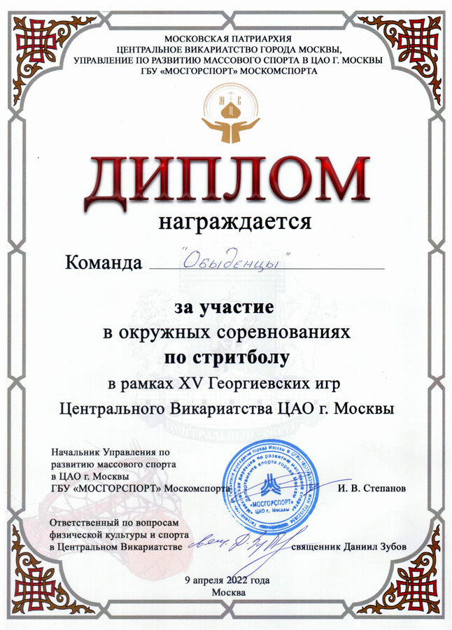 Турнир по стритболу в рамках Окружных XV Георгиевских игр состоялся по благословению митрополита Воскресенского Дионисия, первого викария Святейшего Патриарха Московского и всея Руси, управляющего Центральным викариатством города Москвы, в физкультурно-оздоровительном комплексе «На Таганке».