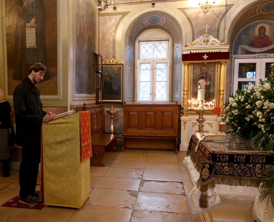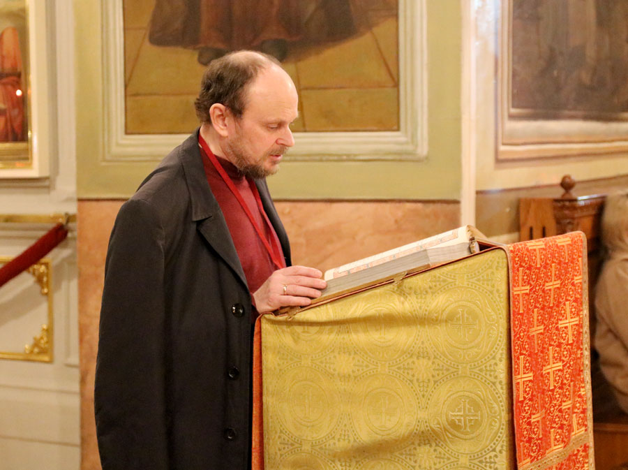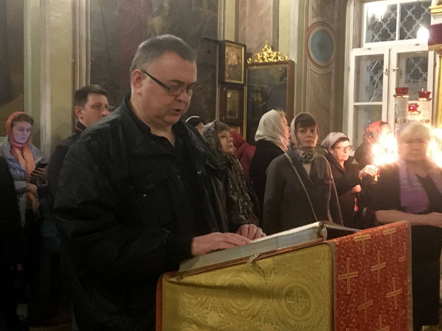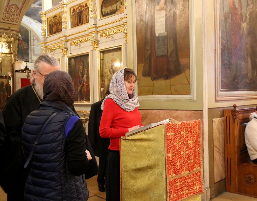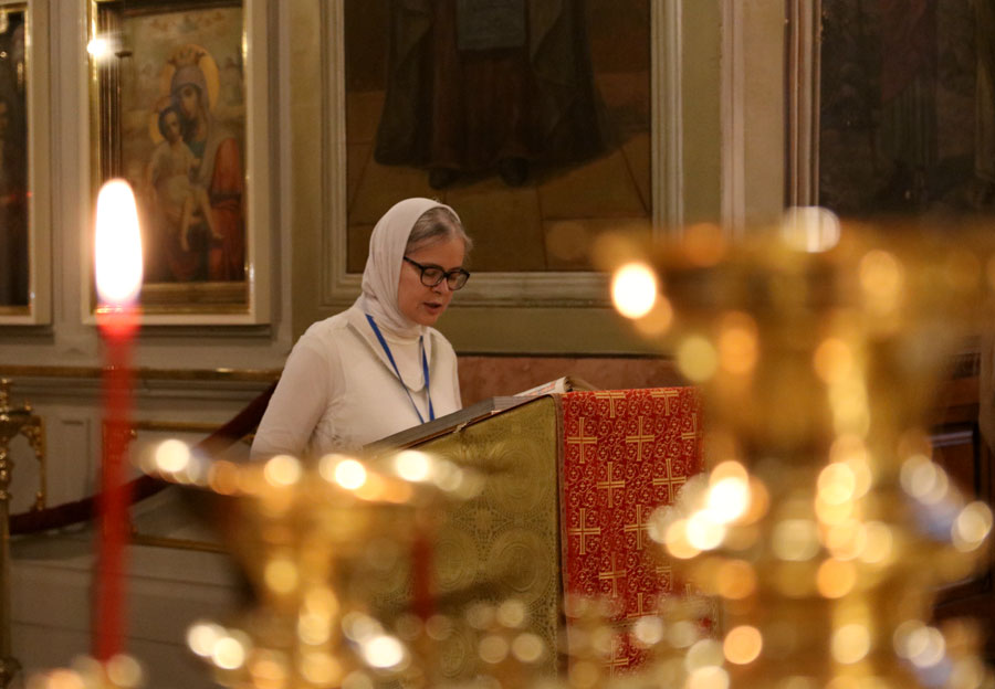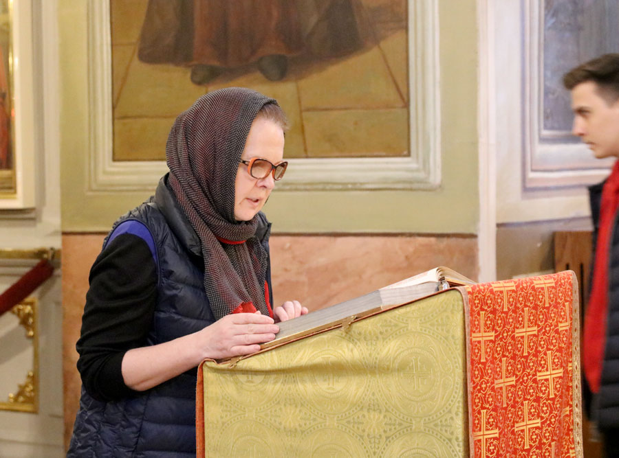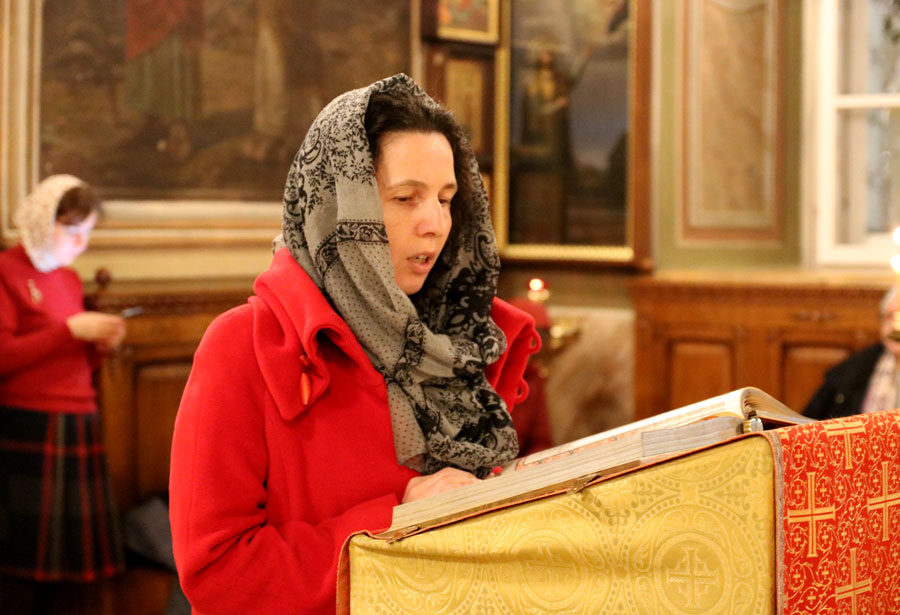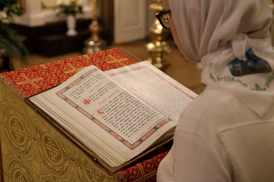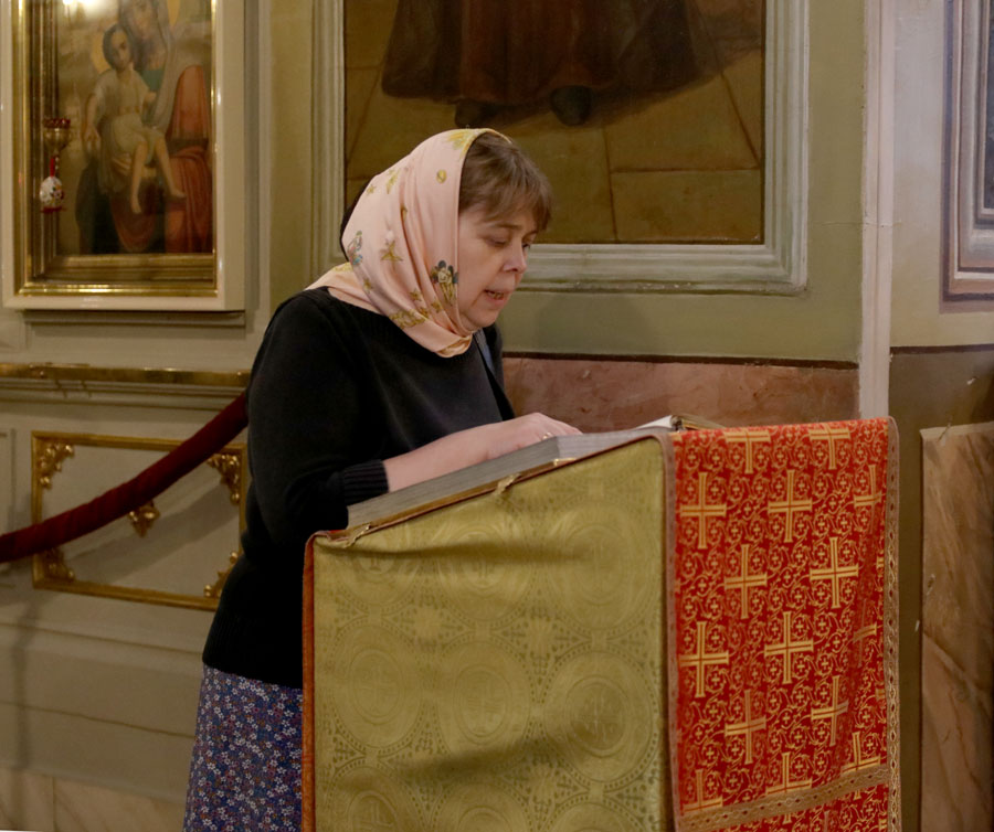 Преподаватели и выпускники групп практической литургики воскресной школы читали в храме Деяния святых апостолов на церковнославянском языке.
