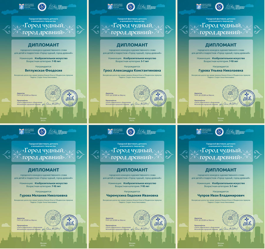 Наша воскресная школа представила на конкурс шесть рисунков (педагог — А. Н. Скурат), все наши участники стали дипломантами конкурса. Всего в номинации «Изобразительное искусство» приняло участие более 500 школьников.
