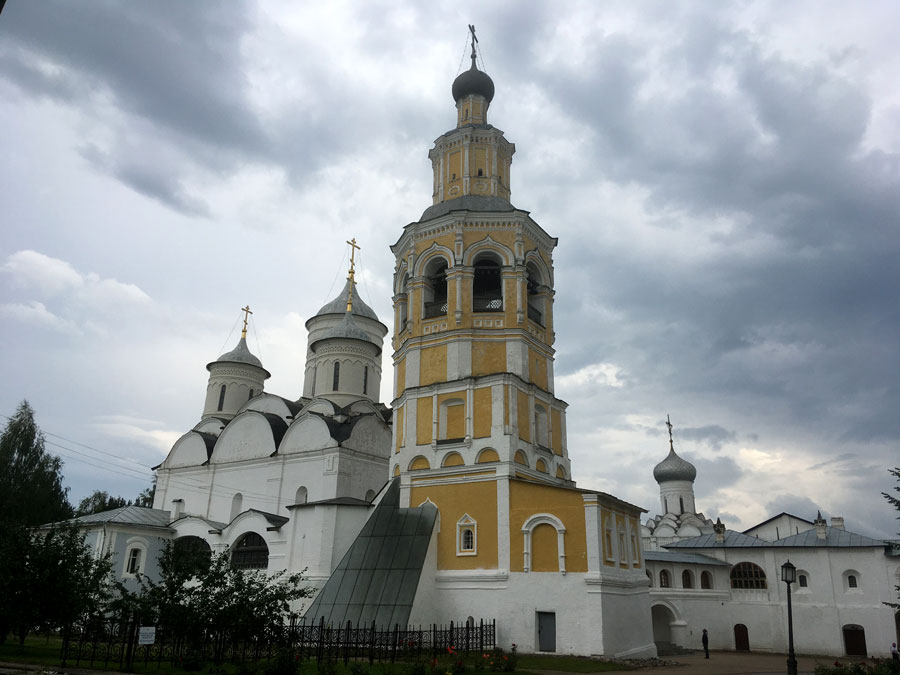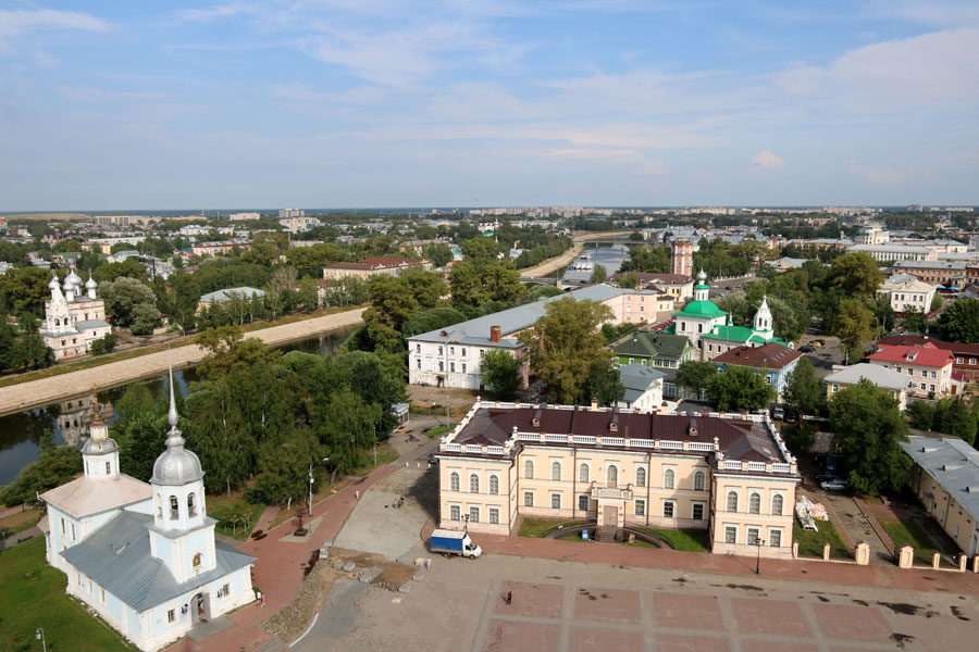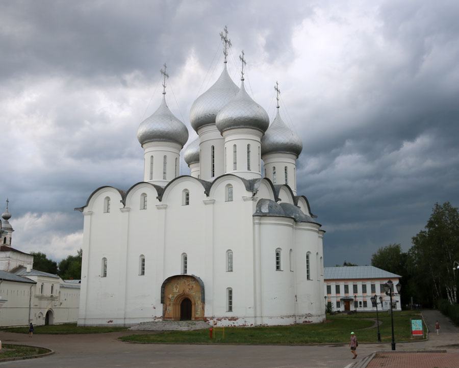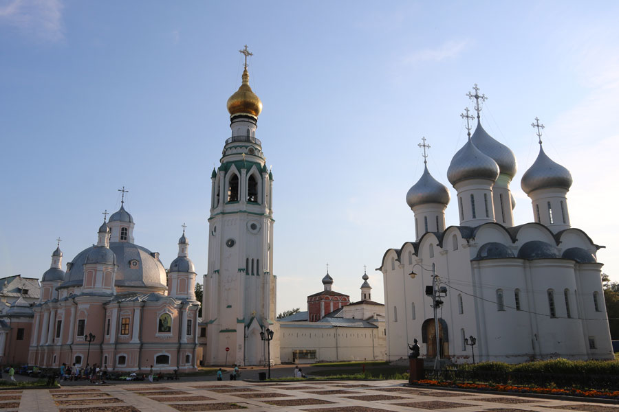 Софийский собор был возведен на средства царя Ивана Грозного в 1568–1570 годах. Эта старейшая каменная постройка Вологды принадлежит к числу больших русских пятиглавых шестистолпных соборов, прототипом которых является Успенский собор Московского Кремля — главный храм Московской Руси.