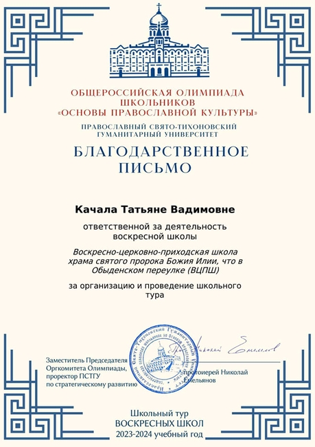 Олимпиада в воскресной школе была организована и проведена ответственной за деятельность школы Т. В. Качалой.
