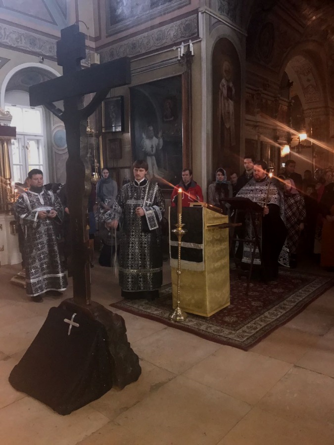 Первую из четырех совершаемых Великим постом пассию совершил настоятель храма протоиерей Максим Шевцов. На богослужении, напоминающем о страданиях Христовых и постепенно подводящем к Страстной седмице, верующие молились перед вынесенным в центр храма Распятием под проникновенное пение мужского хора.