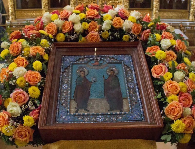 Прибывавшие в храм в течение всего воскресного дня многочисленные паломники имели возможность не только поставить свечи у украшенной цветами иконы первоверховных апостолов, но и приложиться к частицам их святых мощей, которые хранятся в мощевиках у главного алтаря и в Петропавловском приделе.