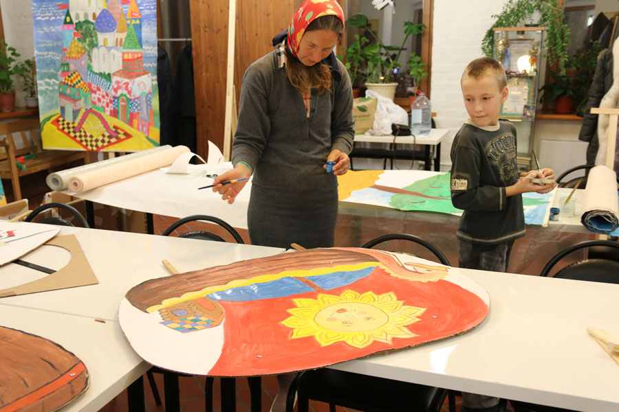 Преподаватели воскресной школы М. В. Судакова, Т. Н. Семенова, М. И. Литвиненко, Е. В. Журбина, приходская молодежь и учащиеся дети и их родители рисуют декорации для детского спектакля.